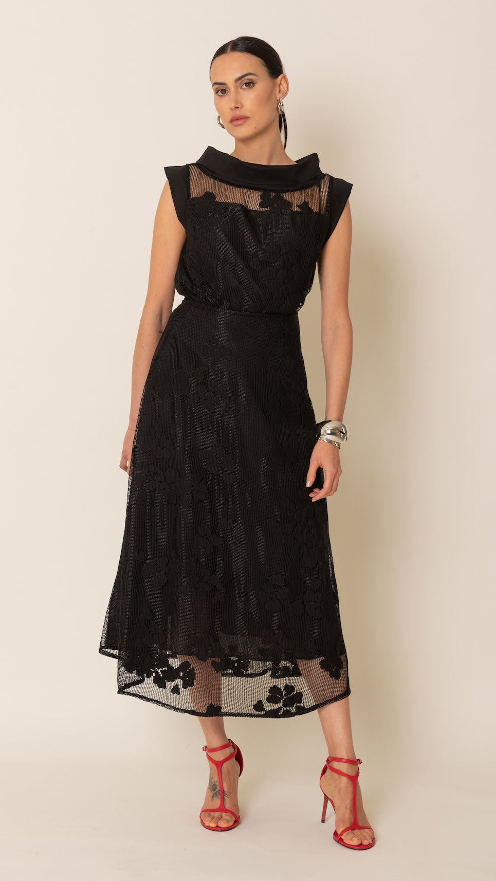 Gonna elegante e sofisticata con un affascinante motivo a pizzo con un inserto in cotone per un tocco di freschezza e comfort. La gonna è perfetta per un look femminile e romantico, ideale per occasioni speciali e giornate in cui vuoi sentirti al tuo meglio.