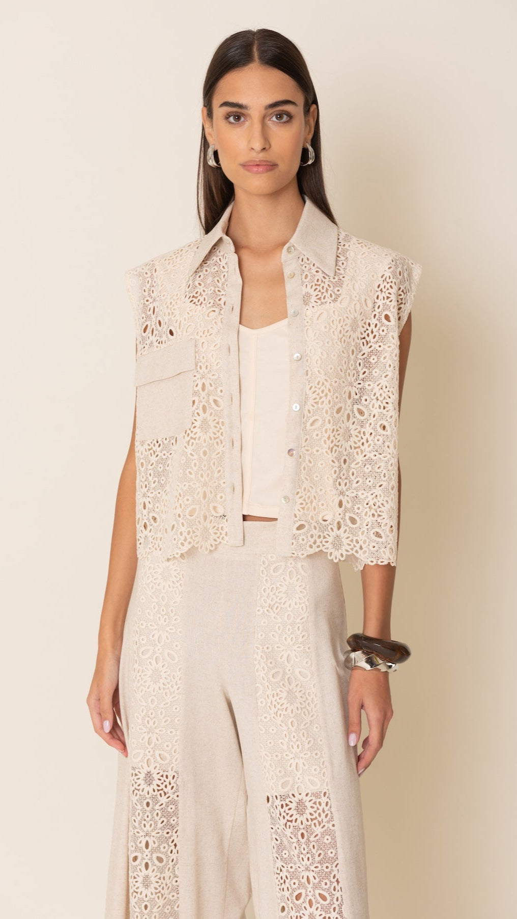Blusa in pizzo di viscosa, un'elegante aggiunta al tuo guardaroba. Il pizzo delicato dona un tocco di femminilità, rendendola perfetta per un look raffinato e confortevole. Scegli questa blusa per un'eleganza senza pari.