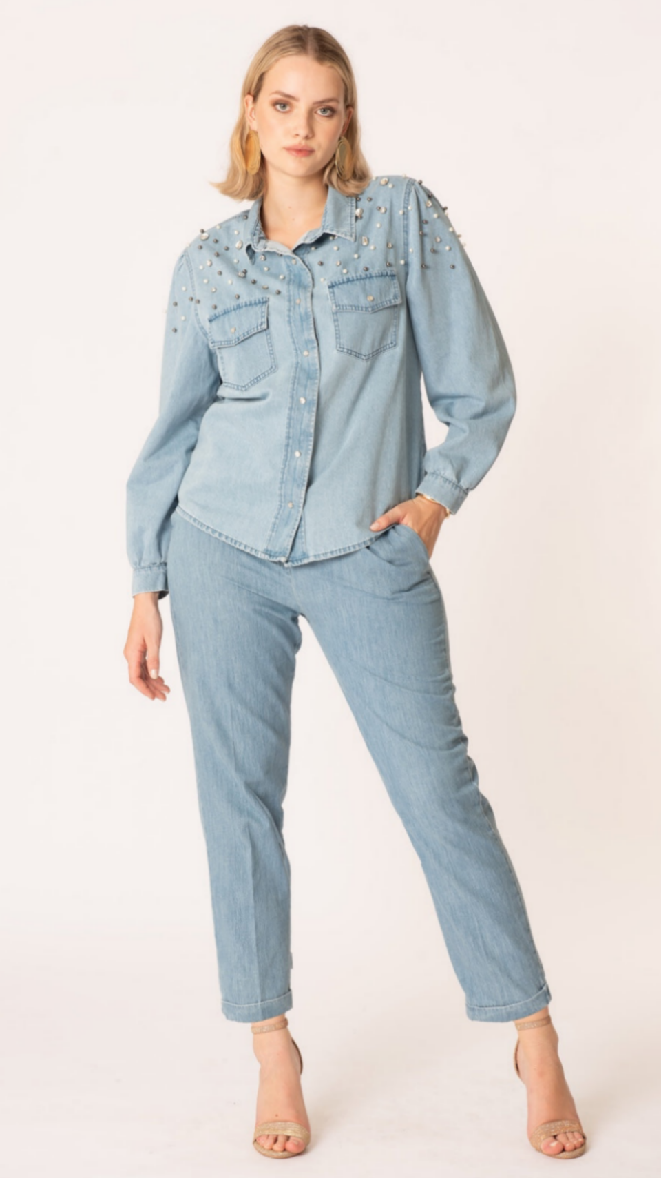 Camicia Chambray Curvy presenta deliziose applicazioni che aggiungono un tocco di stile e originalità al tuo look. Realizzata in morbido tessuto Chambray, questa camicia presenta una linea curvy che si adatta perfettamente alle tue curve. Aggiungi un tocco di eleganza alla tua collezione con questa camicia.
