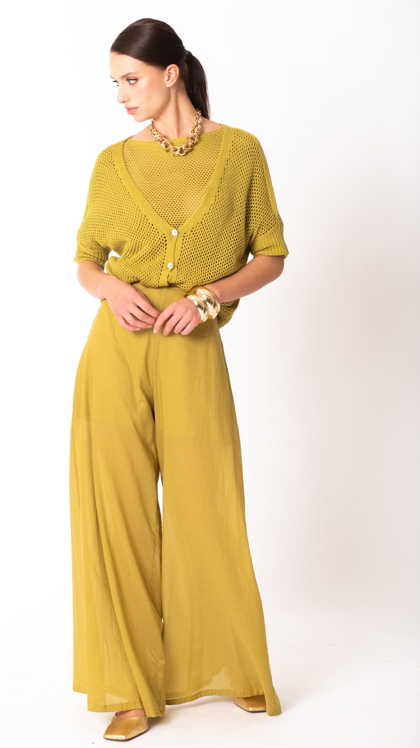 Questo pantalone palazzo in cotone color senape è perfetto per un look elegante e comodo. Il tessuto in cotone garantisce una sensazione fresca e leggera sulla pelle, mentre il taglio palazzo dona un'andatura fluida e sofisticata. La tonalità senape è di tendenza e aggiungerà un tocco di colore al tuo guardaroba.