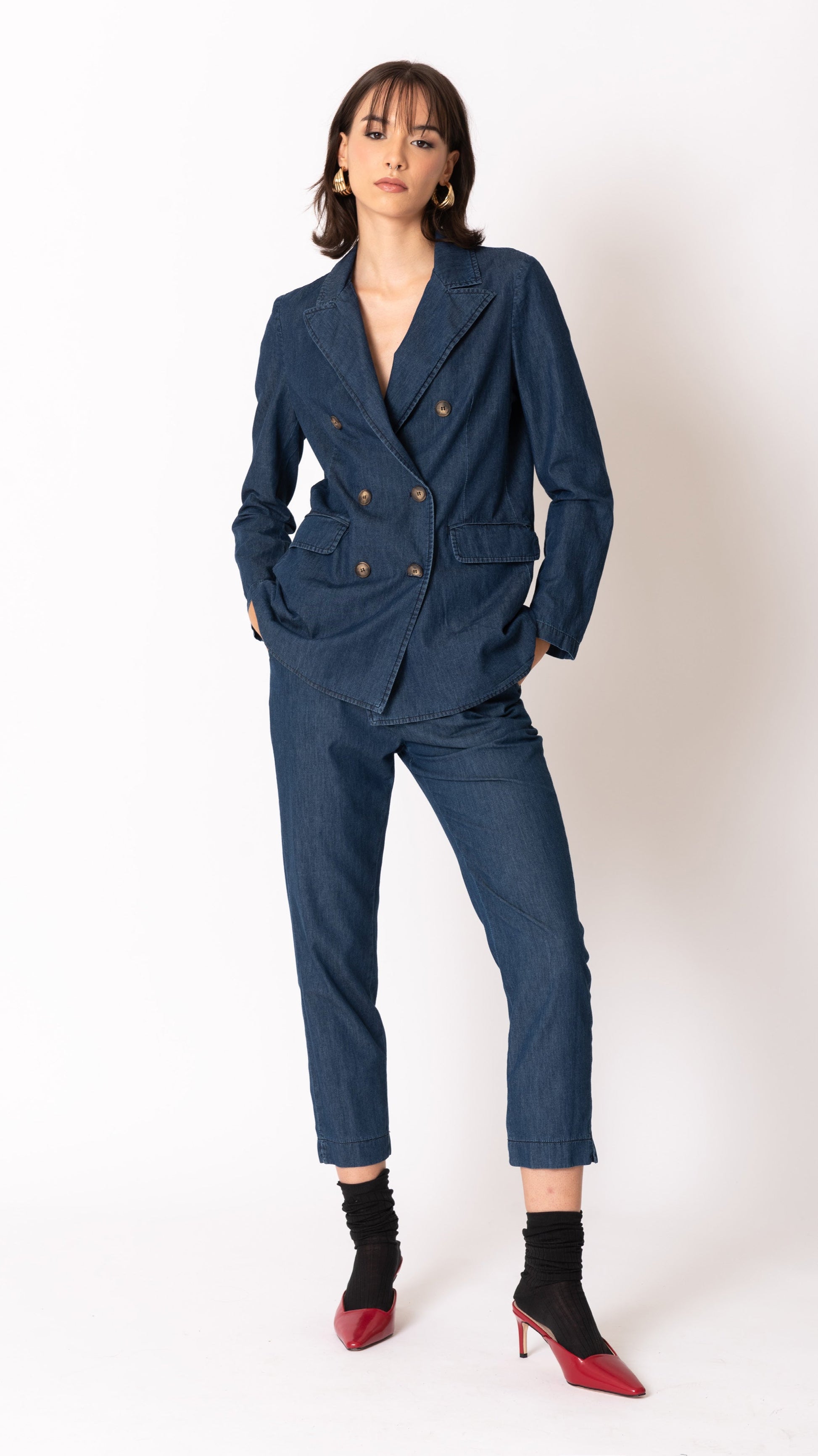 Giacca Chambray doppio petto, perfetta per un look elegante e classico. Realizzata in tessuto chambray di alta qualità, questa giacca a doppio petto completa il tuo outfit con stile e raffinatezza. Abbinata ai pantaloni giusti, è l'ideale per ogni occasione.