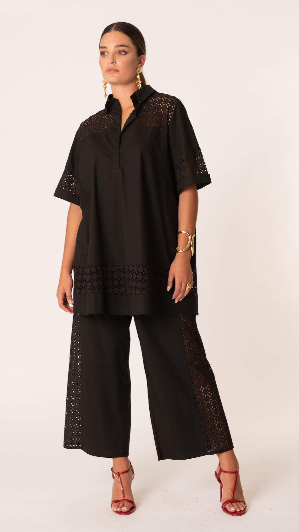 Pantalone in pizzo San Gallo, segue delicatamente le forme del corpo, offrendo una vestibilità perfetta e un comfort duraturo. Grazie al pizzo san gallo, questo pantalone è unico e perfetto per ogni occasione.