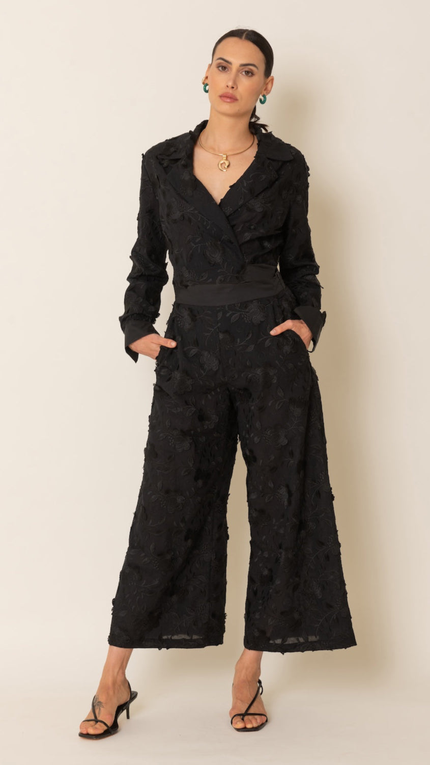 Pantalone palazzo, perfetto per le occasioni speciali. Realizzato in delicato pizzo floreale, aggiunge un tocco elegante e romantico al tuo look. Lasciati conquistare dalla sua morbidezza e dalle sue linee sottili e femminili. Ideale per esaltare la tua figura e il tuo stile in ogni occasione.