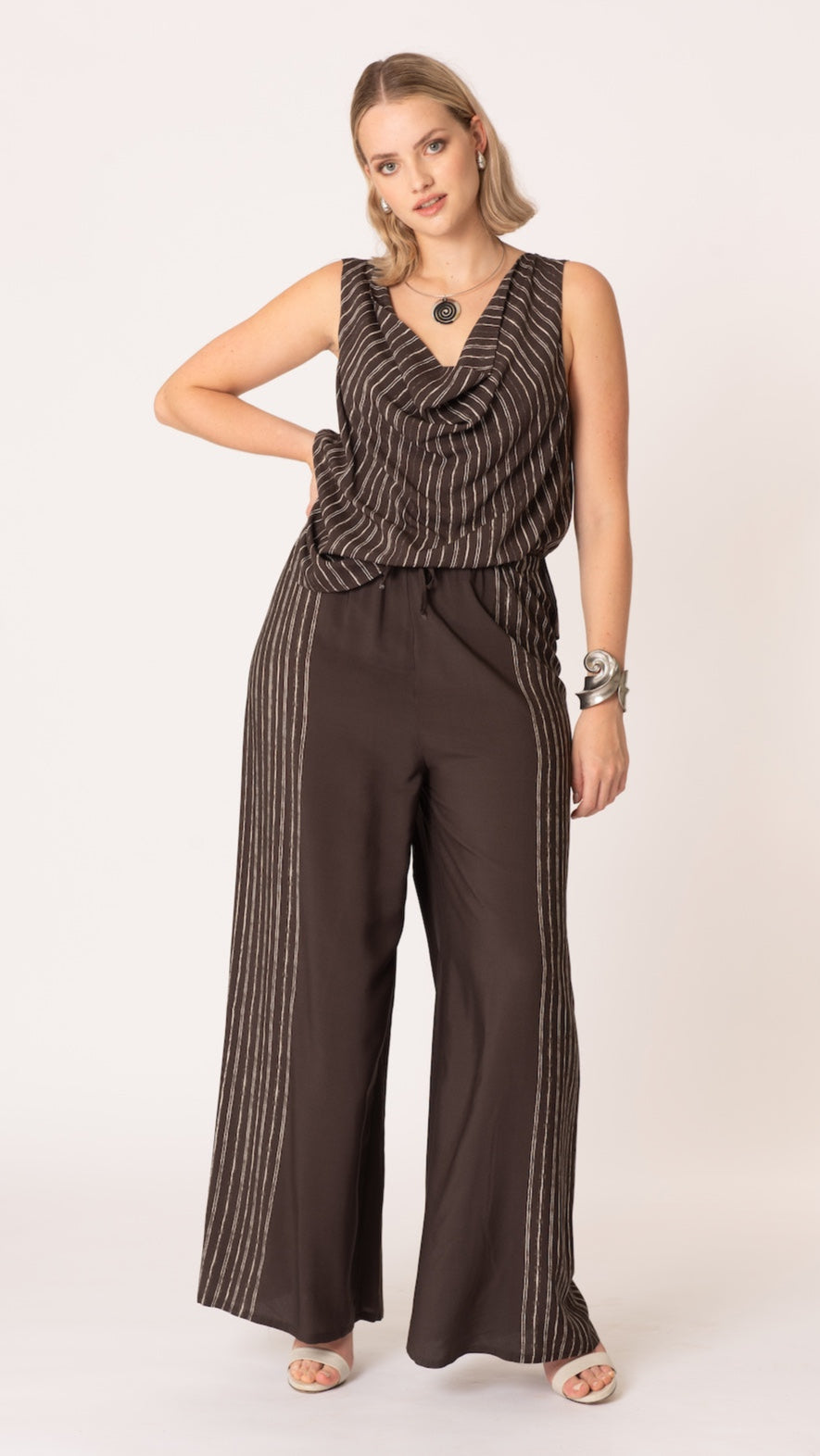 Pantolone palazzo nero con righe bianche in viscosa. Tessuto leggero e morbido, ideale per l'estate. Taglio curvy per una vestibilità comoda e adatta a qualsiasi forma del corpo. Elegante e versatile, perfetto per ogni occasione.