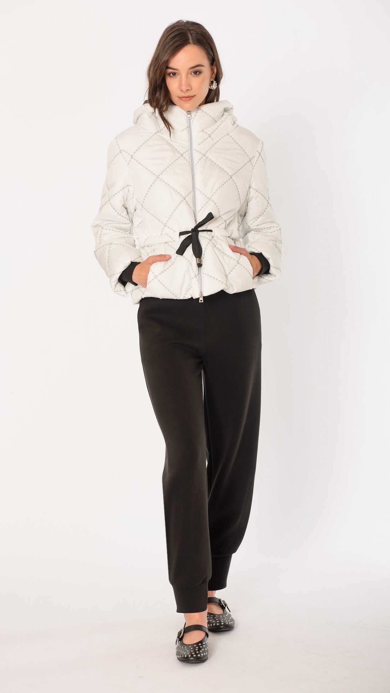 Piumino corto color latte, si distingue per le impunture nere a contrasto che ne definiscono la silhouette in modo elegante e moderno. Realizzato per garantire calore senza rinunciare alla leggerezza, è perfetto per chi cerca comfort e stile in un capo versatile ideale per la mezza stagione.