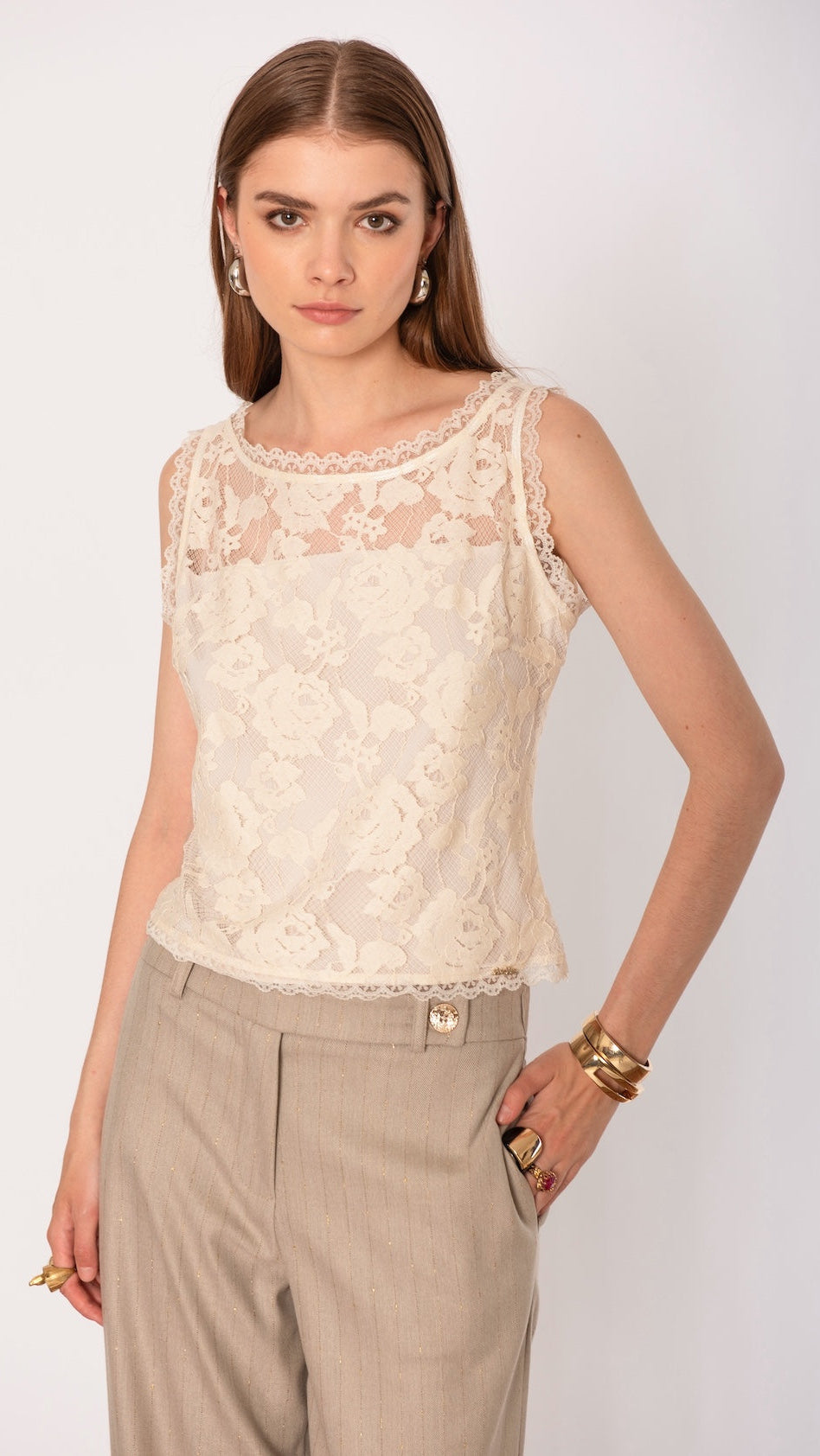 Smanicato in pizzo trasparente unisce. Il pizzo aggiunge un tocco delicato e femminile, perfetto per un look sofisticato e alla moda. Stile senza sforzo e dettagli ricercati si fondono in questa camicia unica.