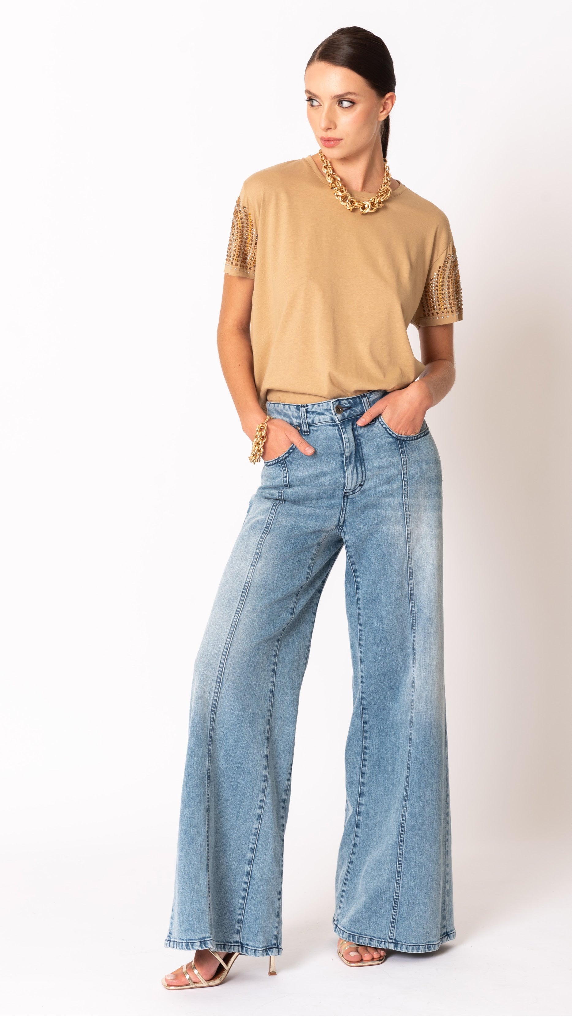 T-shirt in cotone caratterizzata da una elegante applicazione sulla spalla. Disponibile in due colori, nero e bianco, perfetta per un look casual ma al tempo stesso raffinato. Realizzata con materiali di qualità, garantisce comfort e stile in ogni occasione.