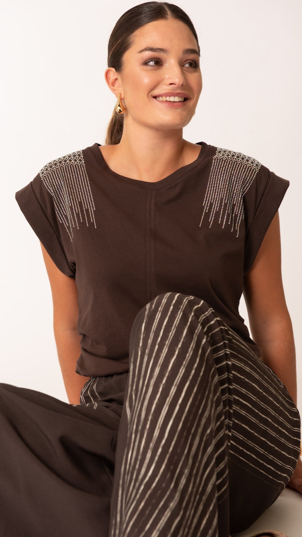 T-shirt in cotone disponibile in 2 colori, arricchita da eleganti strass sulle spalle. Realizzata con materiale di qualità, offre un look sofisticato e confortevole. Perfetta per ogni occasione, dona un tocco di luce e dettaglio al tuo outfit.